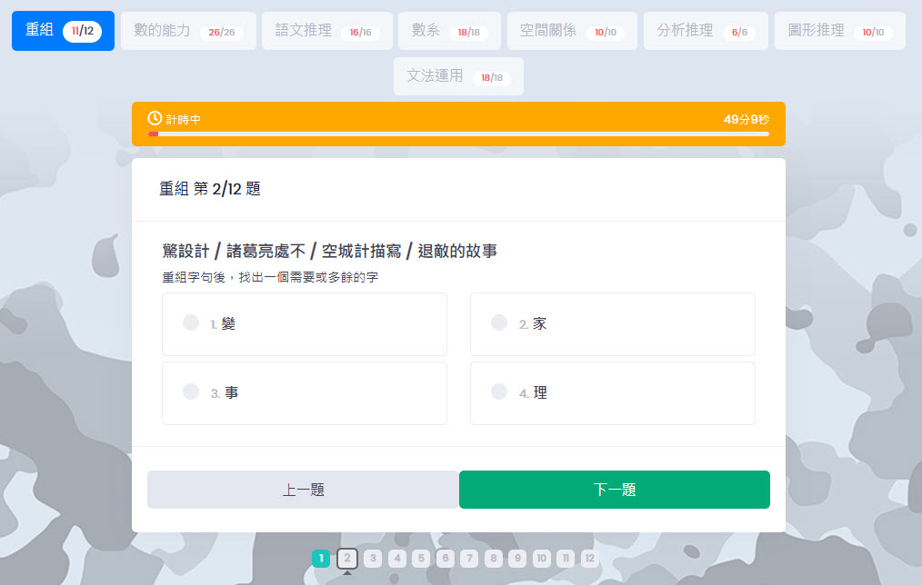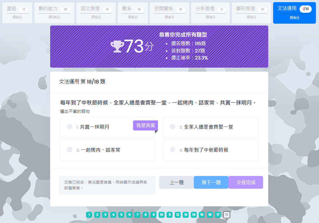• 多題型整合,一鍵開始挑戰 支援多種題型(重組、數列、語文推理、圖形推理等),自動切換介面與作答邏輯,讓學習者沉浸在多元有趣的測驗體驗中。