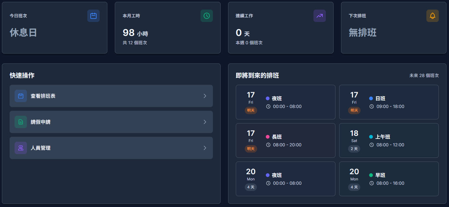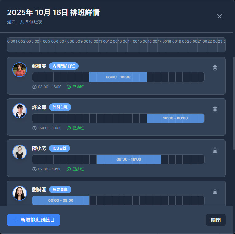 • 深色主題介面,專為專業場域設計 採用醫療級深色主題與色彩區分班別,長時間使用不疲勞,畫面清晰又具科技感。