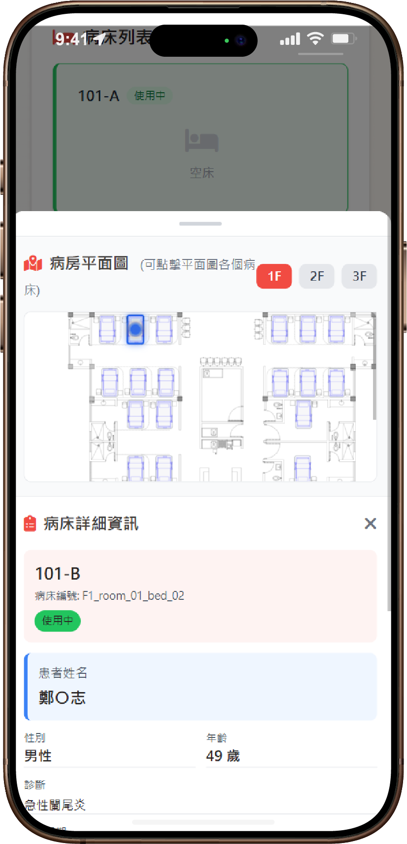 • 全院病房,一圖掌握 以互動式樓層平面圖呈現所有病房狀態,從空床、使用中到清潔維修,動態即時更新,病床調度一目了然。